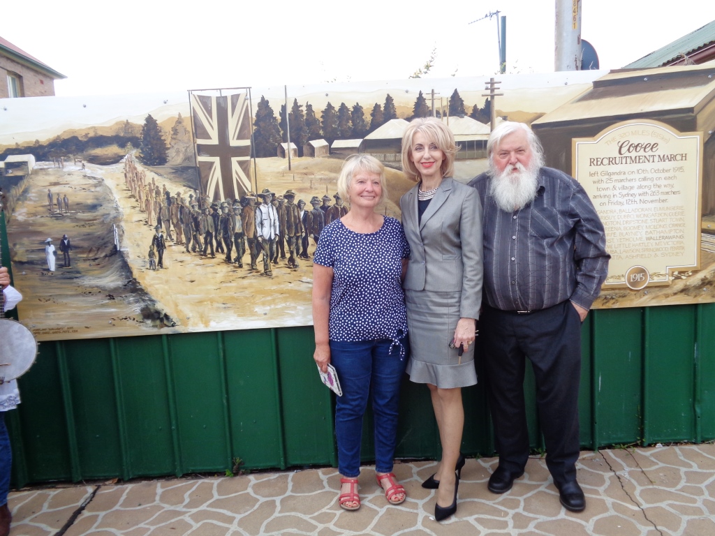 One of the artists with Cr. Maree Statham. Mayor of Lithgow, and Dan Whitty, President of the Wallerawang War Memorial Committee in front of new Coo-ee March mural 2/11/2015